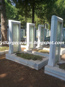 Abideliklere doğru şehitlikler var, sıra sıra... Burası temsili bir şehitlik tabiki... 10 sene kadar önce Çanakkale'ye okul gezisiyle gittiğimizde, Abidelikte böyle bir şehitlik var mıydı hatırlamıyorum. Bu şehitlikler, zamanla okulların yardımı toplanarak yaptırılmış. Gazetelerle şehitlikler için yardım ihtiyacını bildirmişler. Sonra yurt çapında yardım paraları gelmiş ve bu şehitlikler yapılmış... Bir tek şehitliklerin üzerindeki otlar biraz bakımsızdı. Ama yine de, beyaz şehitlikler tüm Çanakkale şehitlerimiz adına yakışır olmuştu bence...